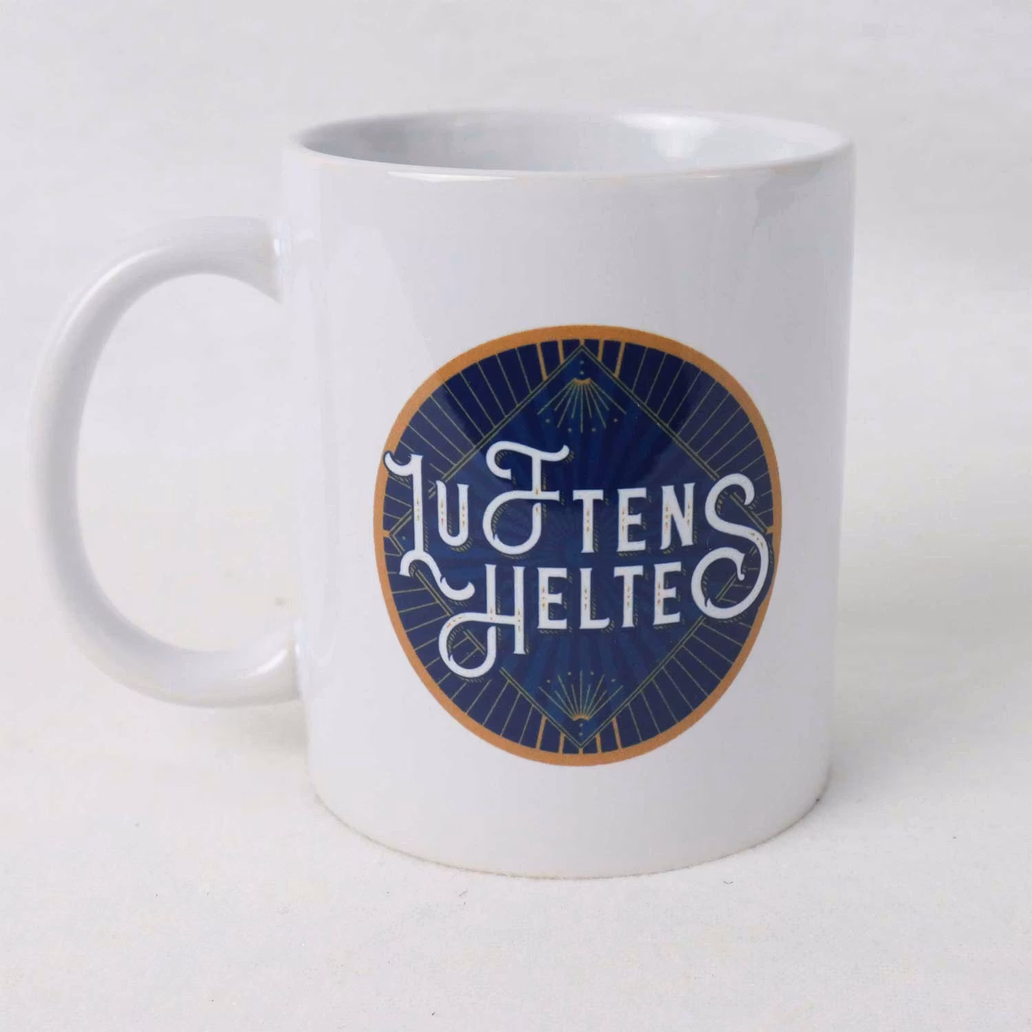 Klassisk Luftens Helte krus med ikonisk logo i blå og guld 💙 Elegant design i hvid keramik – perfekt til kaffe, te og ægte Helte-fans ☕✨