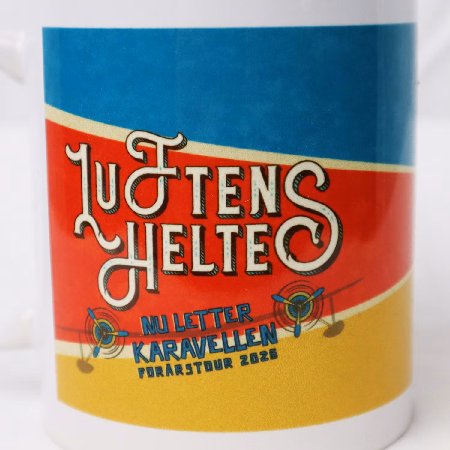 Officielt Luftens Helte tour-krus fra Nu Letter Karavellen 2026 🛩️ Farverigt design med logo og bandmotiv – perfekt til ægte Helte-fans ☕🎶